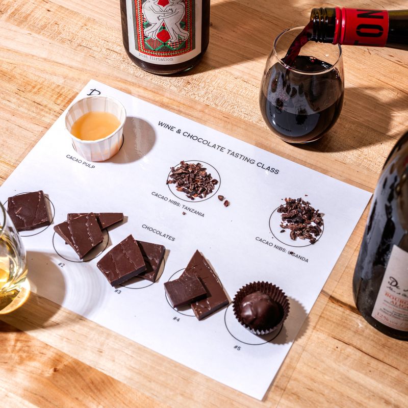 Unser Wine & Chocolate Pairing Class ist ein immersiver Genuss für die Sinne. Diese Erfahrung beinhaltet eine Einführung in unser Unternehmen, was unsere ungeröstete Schokolade aus reiner Herkunft einzigartig macht, und den Ursprung des Kakaos. Die Teilnehmer werden das Fruchtfleisch von Kakaofrüchten probieren und die verschiedenen Ursprünge der Kakaobohnen miteinander vergleichen. So geben sie den Ton an, um in unsere Wein- und Schokoladenverkostung einzutauchen. Die Teilnehmer lernen alles über das Verkosten von Schokolade wie ein Profi sowie über die Interpretation der Geschmacksnoten von Schokolade mit nur einer Herkunft. Bei dieser Verkostung stellen wir 4 verschiedene sortenreine Zartbitterschokoladen und einen handgefertigten Schokoladentrüffel vor. Jede Schokolade wird mit einem von 4 verschiedenen Weinen kombiniert, die während des Unterrichts genossen werden. Wir haben begleitende Arbeitsblätter und Verkostungsräder zur Verfügung, um das Erlebnis zu bereichern, während wir gemeinsam die Welt des Verkostens und Kombinierens erkunden. Während des Unterrichts werden leichte Snacks angeboten